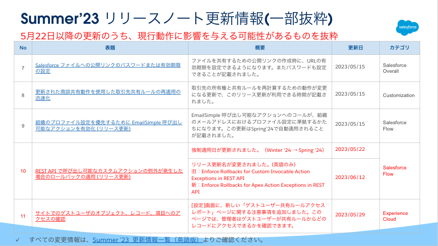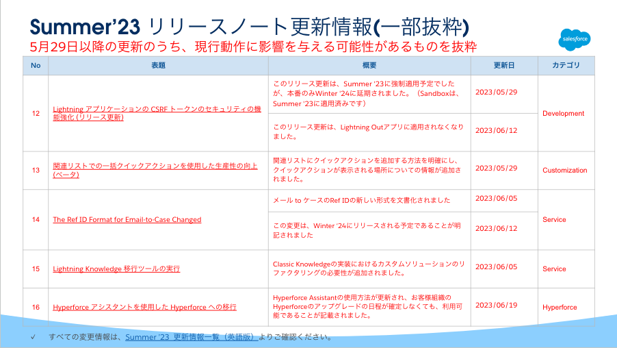 全ての更新情報をご覧頂く場合は、スライド左下の「Summer '23更新情報一覧」の英語版をご確認お願いします。