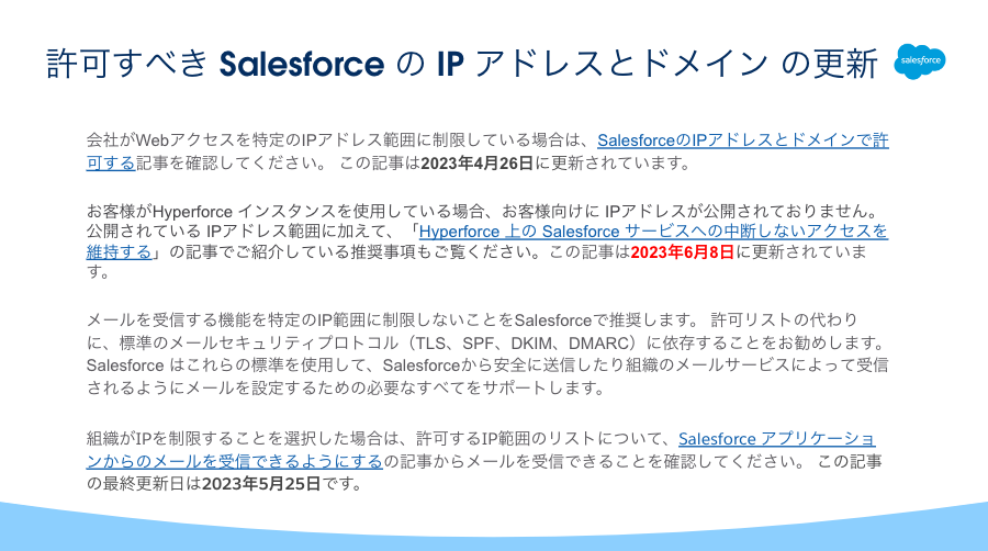 - HyperforceへのアクセスにおいてIPアドレスによる許可リストを構成しなければならない場合、それらのIPアドレスは弊社 Complianceサイト から確認できる旨が追記されました。