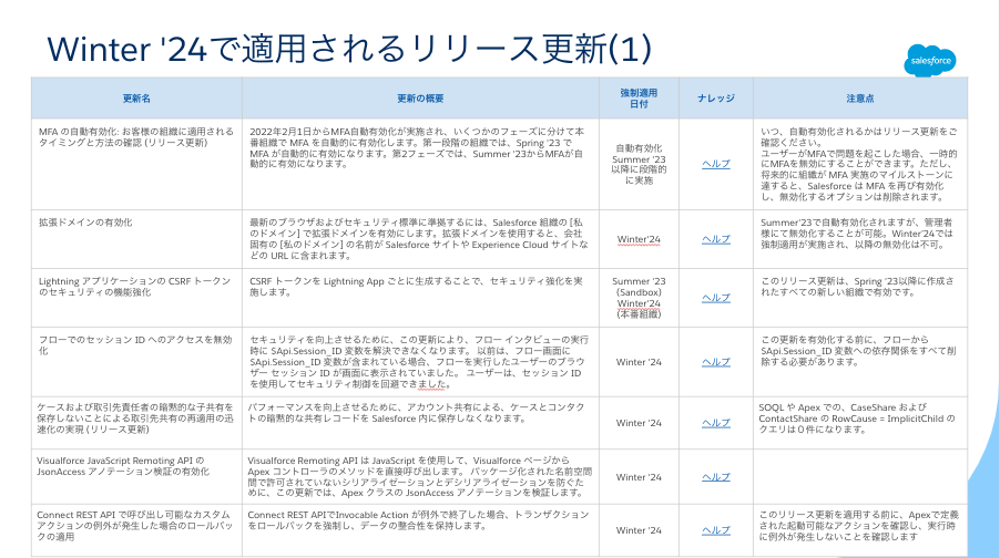 - 強制適用のスケジュールが変わりました。元は Winter ’24 の予定でしたが、Spring ’24 に変更されました。