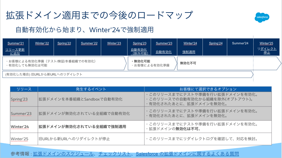前述しました通り、Winter '24 で拡張ドメインが強制適用されると、その後、管理者様は拡張ドメインを無効化することができません。拡張ドメインは影響度の大きい更新であるため、Winter '24 のリリースまでに適用できるようにお客様側でのご準備をお願い致します。