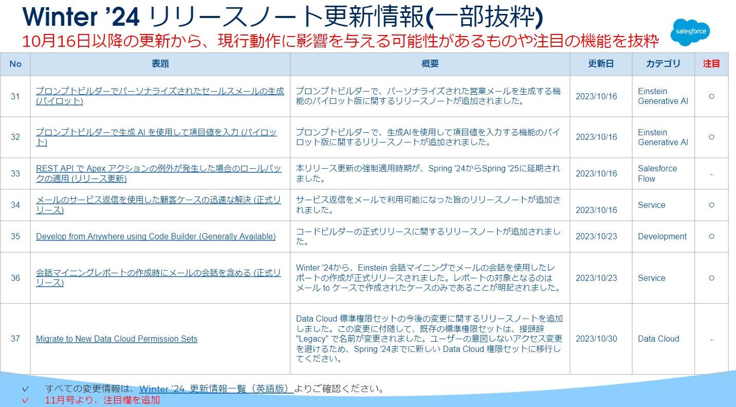 今月は10月16日以降の更新情報の抜粋です。先月まで、現行動作に影響を与える可能性がある更新をピックアップしていましたが、今月から資料に「注目」欄を追加しました。こちらに「⚪︎」がついている情報は、Data Cloud や AI と言った 今 Salesforce  が注力して開発を進めている機能です。ぜひご注目ください。