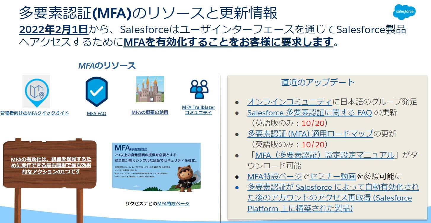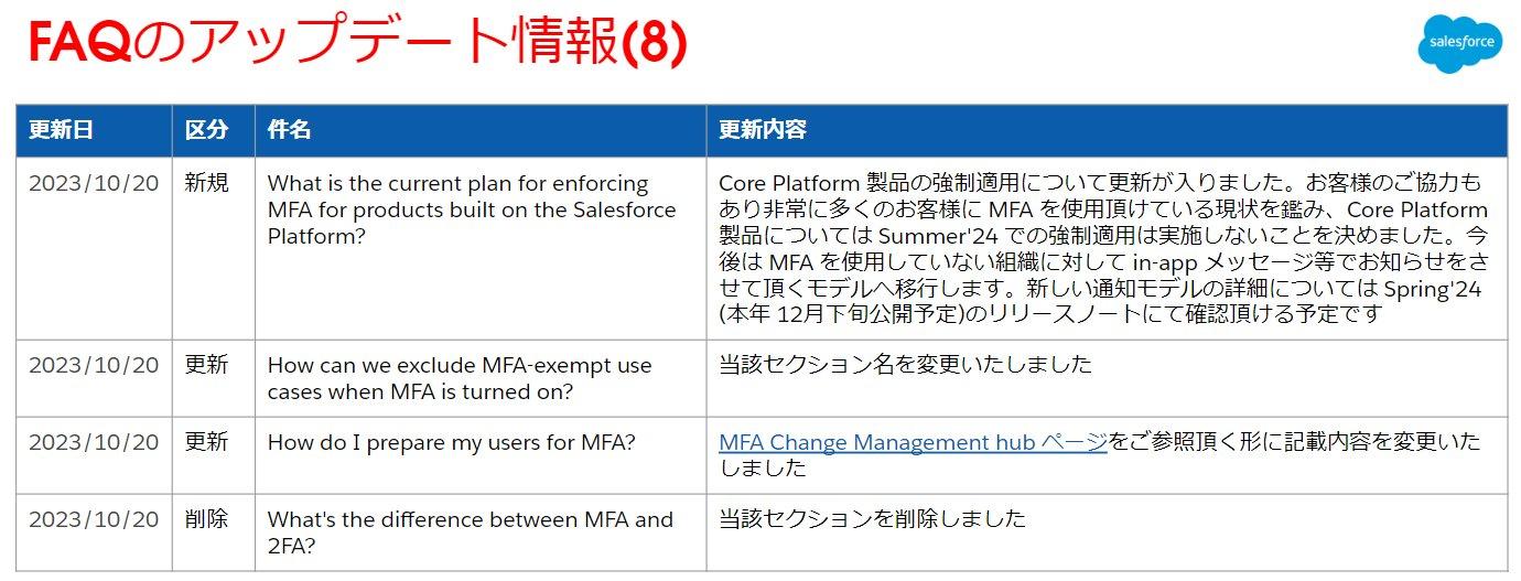 MFAに関する公開情報に「Salesforce 多要素認証に関する FAQ」と「多要素認証 (MFA) 適用ロードマップ」がございますが、この2つの公開情報について10月20日に更新が行われていますのでご紹介します。