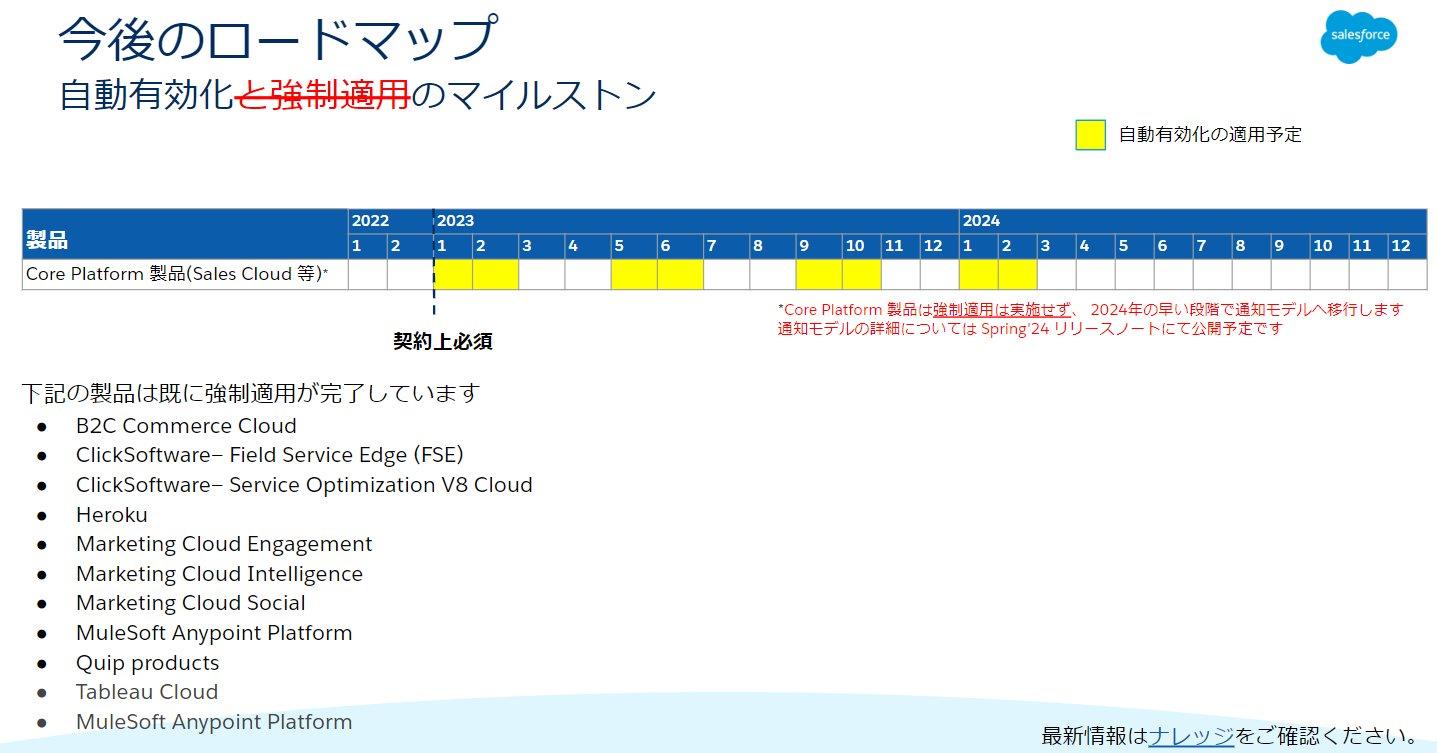 Core Platform 製品につきましては、Spring '24のリリースまで自動有効化を実施して、Summer '24のリリースからは強制適用を段階的に実施する予定となっていましたが、非常に多くのお客様に MFA を導入いただいている現状を鑑みて、Core Platform 製品については 強制適用は実施しないこととなりました。今後は MFA を使用していないお客様組織については、組織内に表示されるメッセージ等でお知らせさせて頂く「通知モデル」へと移行する予定です。通知モデルの詳細については Spring'24 のリリースノートにて確認頂ける予定になっていますのでお待ち下さい。