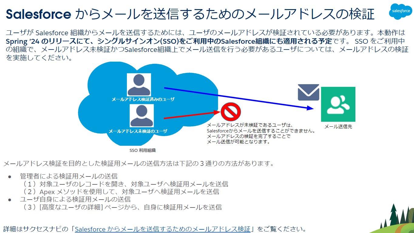 現在のSalesforce ではメールアドレスが未検証であるユーザは、Salesforce からメールが送信できない動作となっています。この動作はシングルサインオン、SSOをご利用中の組織には適用されていませんでしたが、Spring’24のリリースを以って、SSOをご利用中の組織にも本動作が適用される予定となっています。