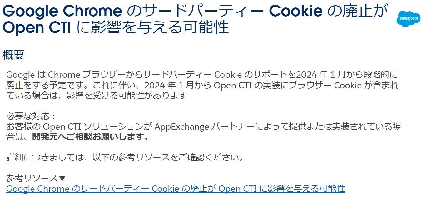 リリースノートの更新でもご紹介しましたGoogle Chrome のサードパーティー Cookie の廃止が Open CTI に影響を与える可能性についての詳細です。お客様の Open CTI ソリューションが AppExchange パートナーによって提供または実装されている場合は、影響範囲について開発元へご相談ください。その他詳細については、リリースノートを併せてご確認ください。