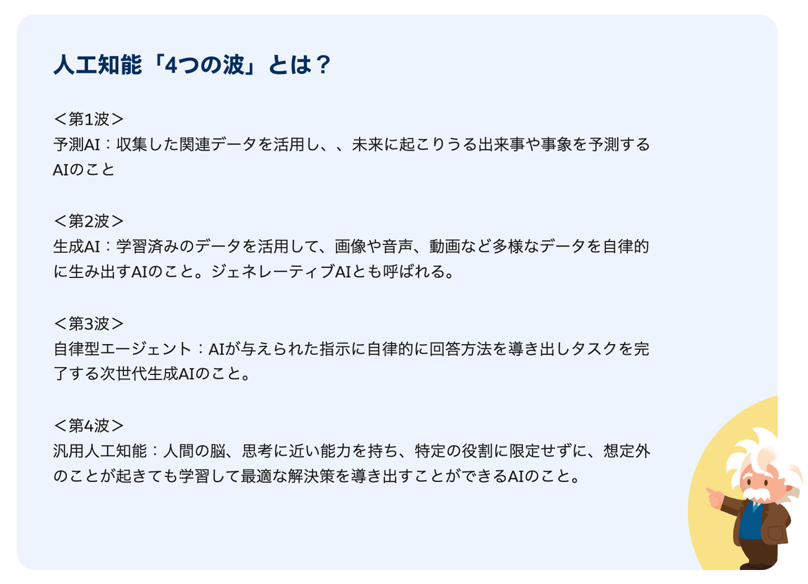 今後訪れる第3波は「自律型エージェント」、そして第4波では「汎用人工知能」が利用できると予測されています。